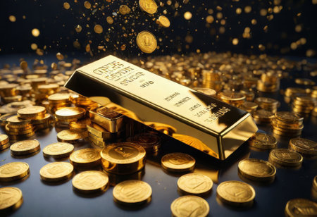 Stunning arrangement of gold bars and coins highlights themes of wealth and luxury. Perfect for financial concepts, investment imagery, or wealth representation.
