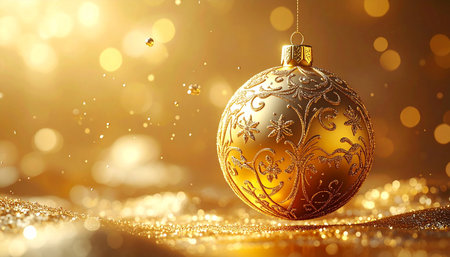A beautifully detailed golden ornament rests in soft focus, surrounded by shimmering lights that evoke a warm, festive atmosphere. The holiday spirit is palpable, inviting joy and celebration.