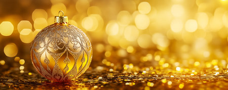 Close-up of a decorative gold christmas ornament with intricate glitter patterns, surrounded by warm bokeh