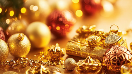 Various golden and transparent Christmas ornaments with decorative ribbons are displayed. The scene includes detailed textures and a blurred background creating a soft, warm ambiance. Suitable for a variety of holiday themed commercial and editorial projects.