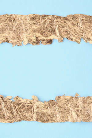 Golden stripes on pastel blue background. Golden torn gold, foil scraps. Copy space, art design template.