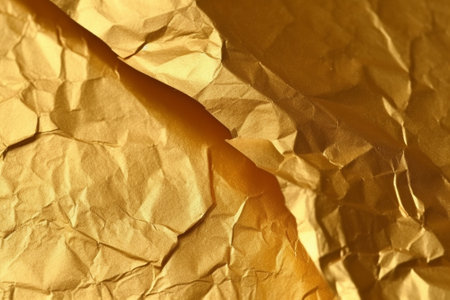 Close-up view of crinkled golden foil showcasing a shiny texture and rich, reflective surfaces that create an elegant and captivating background.