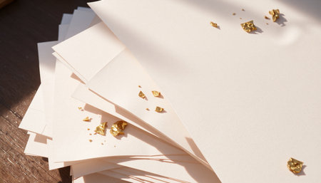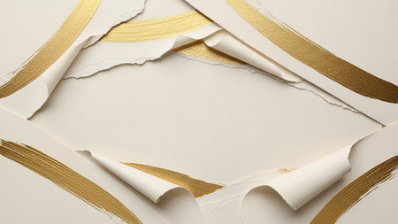 A textured golden surface is artfully arranged with torn paper fragments. The warm lighting creates a luxurious and inviting atmosphere.