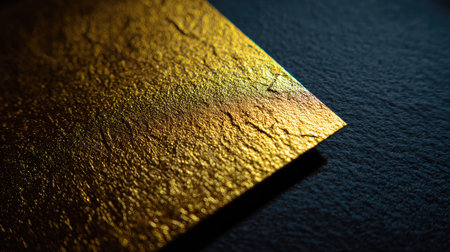 This image showcases a close view of shimmering gold foil with a rich texture against a dark background, highlighting intricate patterns and captivating light reflections.