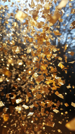 Captivating scene of golden confetti falling gracefully through the air, creating a festive atmosphere filled with bright bokeh lights and sparkling joy.
