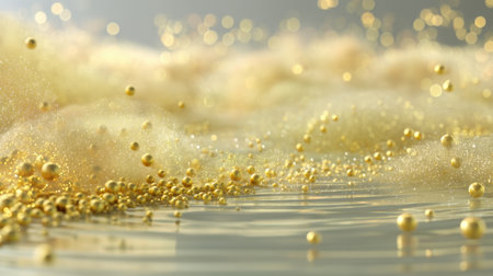 This captivating image showcases shimmering gold particles gracefully floating on a calm water surface, creating a dreamy and elegant atmosphere with soft bokeh lights.