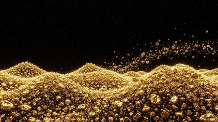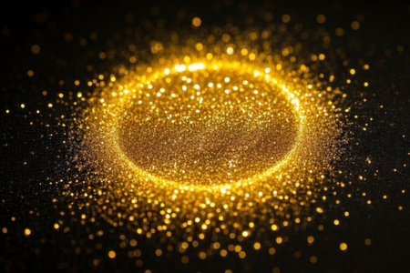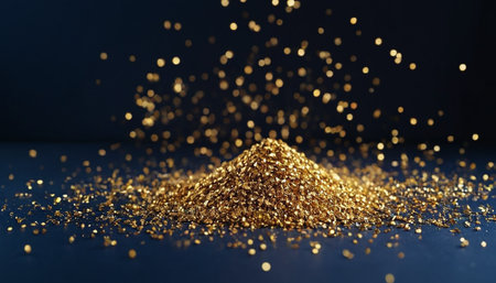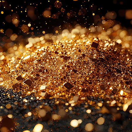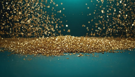 Shimmering gold particles scattered on a reflective surface in a vibrant setting