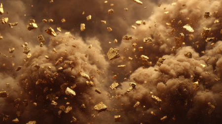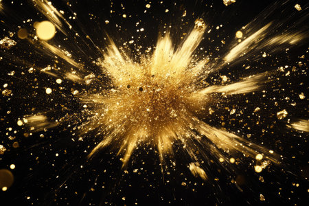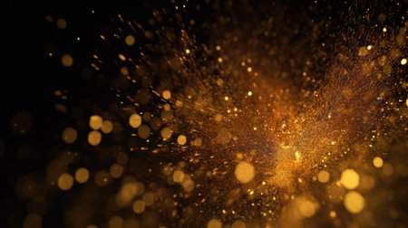 Stunning explosion of golden particles creates mesmerizing visual effect, showcasing shimmering dust and sparkling fragments against dark background. dynamic movement evokes sense of energy