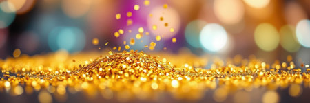 A Vibrant Golden Celebration with Colorful Confetti and Sparkling Dust for Festive Joy
