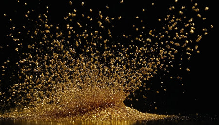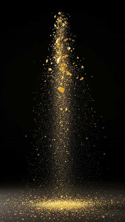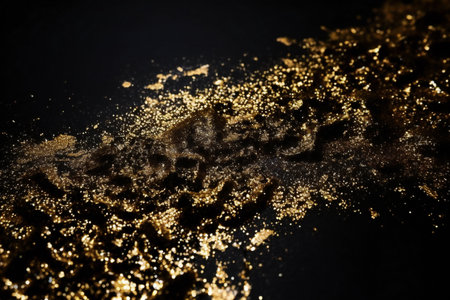 A stunning capture of gold dust and shimmering particles in a dramatic explosion against a dark backdrop, creating an enchanting and mystical effect.