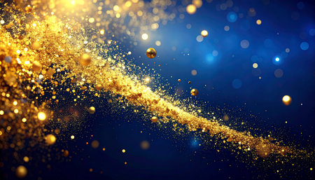 A stream of golden glitter and spheres drifts across a dark blue background with glowing bokeh lights.