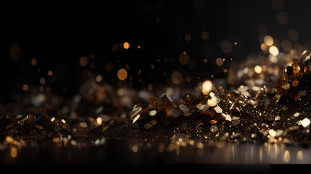 Gold confetti floats over a dark surface, catching light with sparkling drama and a luxurious mood. Ideal for events, parties, and celebration themes to evoke glamor and anticipation. Generated A.I.