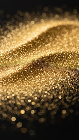 Abstract close-up of golden glitter particles forming a wavy surface with soft bokeh lights against a dark background, creating a texture.