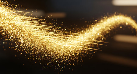 This stunning image features glowing gold particles radiating bright illumination against a dark background, creating a magical and dynamic atmosphere.