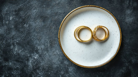 This stunning image features two elegant gold wedding rings gracefully placed on a textured plate. The dark backdrop adds depth, symbolizing love and commitment.