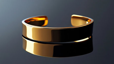 This elegant gold cuff bracelet features a shiny surface reflecting beautifully on a dark background, perfect for showcasing jewelry and accessory styles.