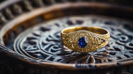 A captivating golden ring featuring intricate designs and a sparkling gemstone, resting elegantly on dark fabric, ideal for showcasing luxury jewelry.