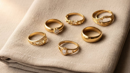 A collection of elegant gold rings displayed on a soft fabric surface, showcasing intricate details and a touch of luxury, perfect for celebrations or jewelry design.