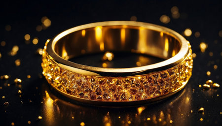 Close-up view of a stunning golden ring resting on luxurious sparkling fabric. The exquisite shine and texture create a captivating and elegant visual.