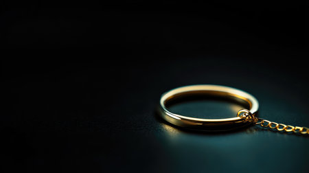 A stunning gold ring with an attached chain lies elegantly on a dark surface, showcasing its shine and design. Perfect for fashion and jewelry collections.
