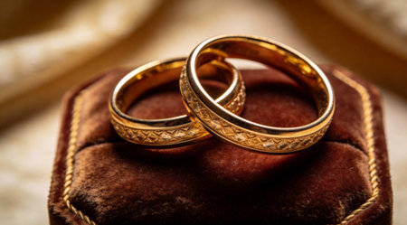 Gold wedding rings designed for newlyweds during the ceremonial marriage ceremony.