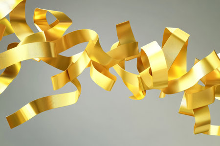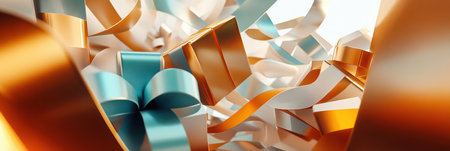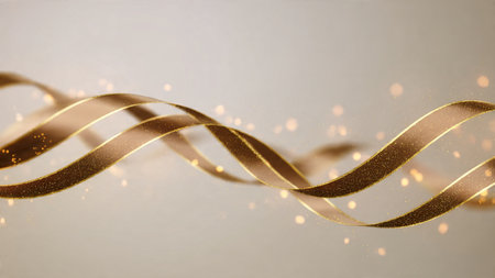 Shimmering golden ribbons twist gracefully in the air, surrounded by sparkling confetti and soft bokeh lights, perfect for adding a festive touch to celebrations.