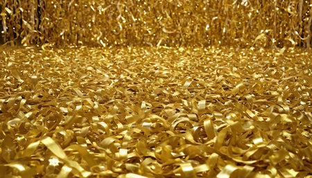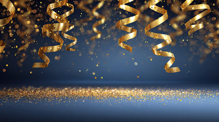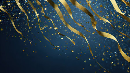 A mesmerizing display of glimmering gold streamers and sparkling confetti fills the air, evoking a joyous and festive atmosphere perfect for celebrations and special events.