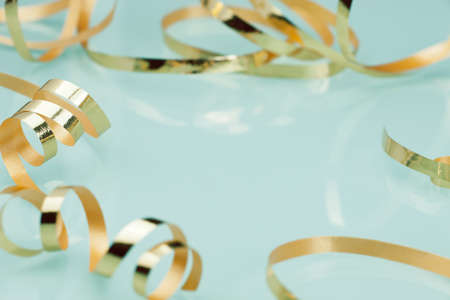 Gold curled ribbons and confetti against a soft neutral background. Celebration and festive vibe