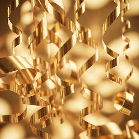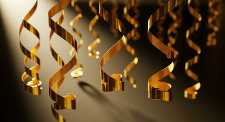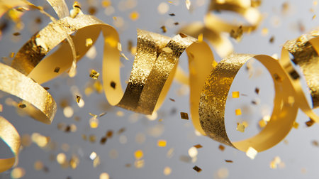 This stunning image captures golden ribbons intertwined with sparkling confetti, creating a festive atmosphere perfect for celebrations, parties, and special events.