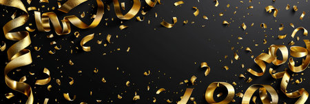 Golden Confetti and Ribbons on Black Background Festive Celebration for Party, Banner, or Luxury
