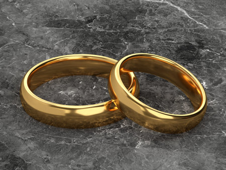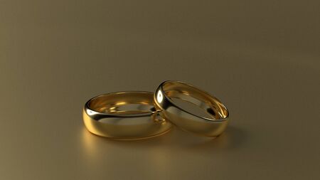 Two wedding gold rings lie next to each other on marble background. 3d rendering