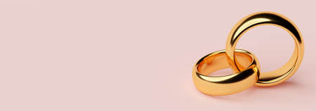 Banner of two wedding gold rings lie on each other with blank space background. 3d rendering
