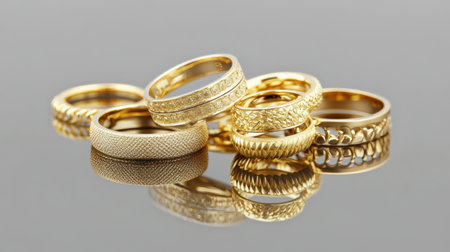 two gold wedding rings reflected on blurred gray background