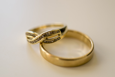 Pair of gold wedding rings on the table