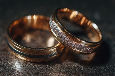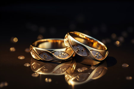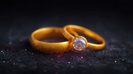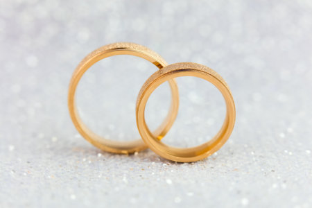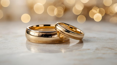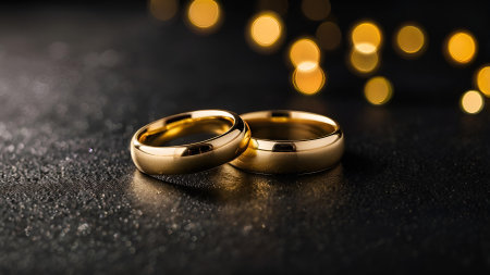 Two golden wedding rings rest on a sparkling background, symbolizing love and commitment.
