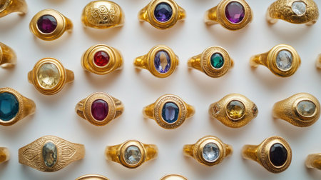 Many Gold rings of different shapes on a white concrete background.