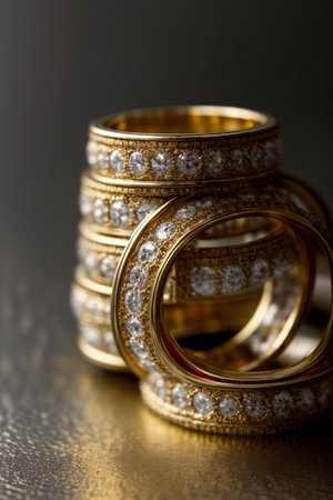 gold rings jewelry with precious stones close up macro glitter and reflection