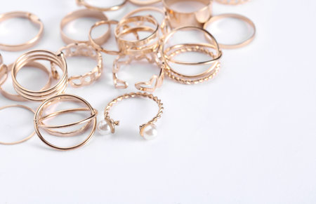 Many Gold rings of different shapes on a white background. Jewelry store, beauty concept