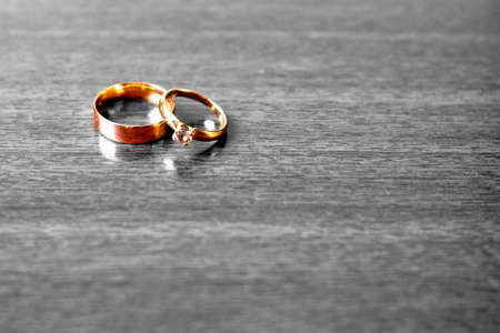 Pair of golden wedding rings on a wooden floor