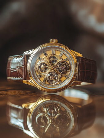 A mesmerizing closeup image of a luxury watch revealing its sleek design and intricate dials The reflective surfaces and fine craftsmanship are enhanced by soft focused lighting showcasing the shimmer and detail of the watch face and strap