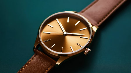 This striking gold watch features a brown leather strap and a minimalist design, symbolizing sophistication and timeless elegance suitable for any occasion.