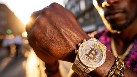 A close-up shot captures a person's wrist adorned with a Bitcoin-themed wristwatch and bracelets. The focus is on the shiny watch, which features a Bitcoin symbol. Sunlight provides a bright backdrop. This image could be used for various editorial or commercial projects related to finance.