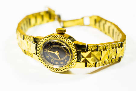 Old retro golden feminine wristwatch. Isolated on a white background.