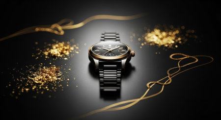 Detailed view of watch with golden specks, water droplets, and blurred background