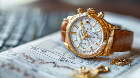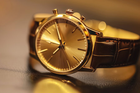 An elegant goldfaced wristwatch with a brown leather band and precise timekeeping is a luxurious, classic accessory, stylish, sophisticated, and versatile