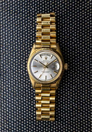 CREMONA, ITALY - MARCH, 2019: Rolex Oyster Perpetual Day- Date watch on metal background. Rolex SA is an important Swiss luxury company in the production of wrist watches, founded in London in 1905