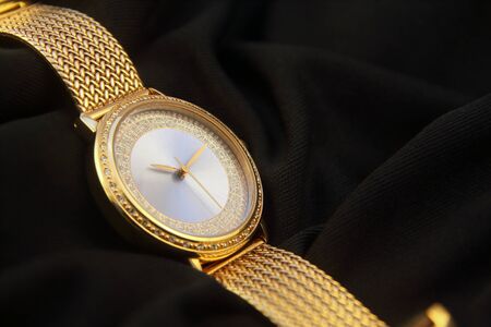 Gilded wristwatch for women with studio lighting, lying on a dark background.