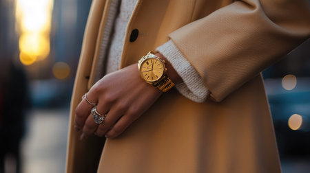 Close-up of a woman's hand wearing a golden wristwatch, styled with elegant accessories in a European city, leaving space for text.
