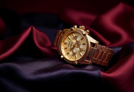 A luxurious golden watch is elegantly displayed atop a flowing fabric, showcasing its intricate details. The rich tones of the material create a captivating contrast and draw attention.