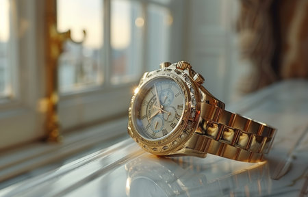 Elegant gold wristwatch with detailed craftsmanship, placed on a marble surface near a sunlit window, exuding luxury and sophistication.